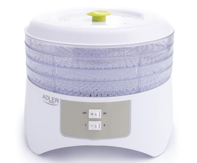 Sušilica za gljive, voće i povrće Adler AD 6654, snaga 400 W, 4 sita, ventilator, dvostupanjska kontrola temperature, miran rad, ventilator, sustav zaštite od pregrijavanja, automatski isključivanje, cijena cca PLN 130